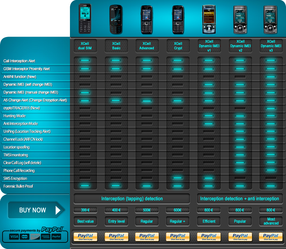 Guarantee: fully two years standard limited guaranteeIt includes all XCell Advanced features (GSM Interceptor Proximity Alert, Call Interception Alert) plus: - SMS encryption feature:in case of interception warning you can send encrypted SMS. Please note that the other phone should have the same SMS encryption software installed, for message decryption purposes. Extra encryption applications are provided for 100 euro/application in jad/jar format. Extra encryption applications can be installed on any java enabled phone or Symbian OS.
